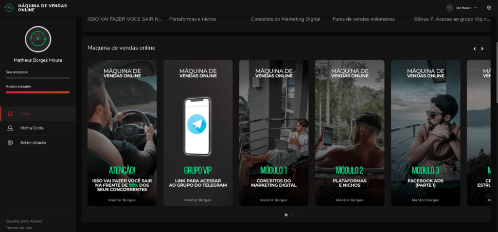 Produtos e Estratégias "Máquina de Vendas": Você irá entender a única estratégia secreta e definitiva que uso para vender cada produto no automático como afiliado e produtor. Além disso, irei te ensinar na prática como escolher o produto certo capaz de te gerar vendas e lucros em escala.
